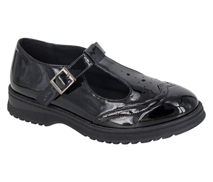Step into sophistication with the Cipriata G 724AP 'DINA' Black Patent PU Buckle T Bar Brogue Shoe. This elegant footwear features a sleek black patent finish that exudes a polished charm, perfect for both formal and casual occasions. The distinctive buckle detail on the side adds a touch of flair, while the TPR sole ensures durability and comfort with every step. Elevate your shoe collection with this versatile and stylish choice that seamlessly blends classic design with modern appeal.