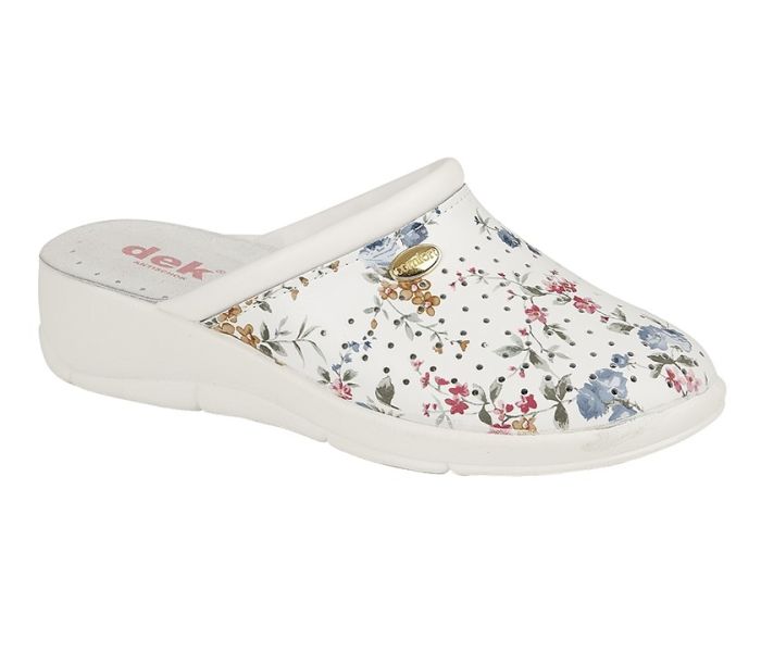 Step into comfort and style with the Dek L210GM White Floral Clog. Crafted from premium white floral coated leather, this clog features a charming floral print on the sole that adds a touch of elegance to your everyday look. The anti-shock leather footbed ensures all-day comfort, while the durable blown PVC sole provides excellent traction and support. Perfect for both casual outings and relaxed indoor wear, these clogs are a must-have addition to your footwear collection.