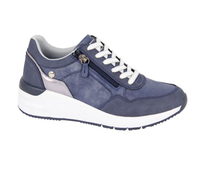 Step into style and comfort with the CIPRIATA Women's 'DELIA' Navy/Silver PU Sneakers. Featuring a chic 6-eye lace and zip-up design, these wedge trainers combine functionality with a modern aesthetic. The working zip adds convenience, while the textile sock and lining ensure breathability for all-day wear. With a lightweight Phylon midsole and durable TPR sole, these sneakers provide excellent support and traction, making them perfect for both casual outings and active days. Elevate your footwear collection with these versatile and fashionable sneakers.