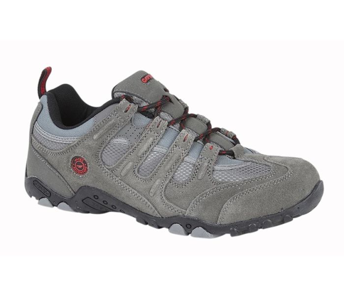 Experience the perfect blend of style and functionality with the HITEC Men's Hiking Shoe, featuring a striking charcoal grey design accented with bold red highlights. Crafted from premium real suede and textile mesh, this shoe ensures durability and breathability for all your outdoor adventures. The innovative EVA cushioning footbed provides exceptional comfort, while the ghillie lacing system offers a secure fit for any terrain. With its MDT moulded rubber tread outsole, you can confidently tackle rocky paths and slippery surfaces, making this trail shoe an essential companion for your next hike.