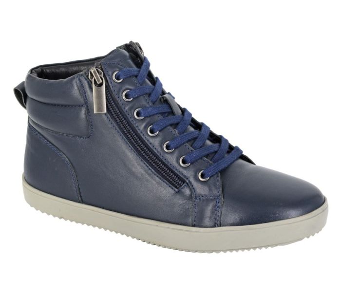 Step into style and comfort with the CIPRIATA Women's 'ADALIA' Navy Leather High Top Sneaker. This chic ankle boot features a sleek design with 7 eyelets and working twin zippers, allowing for easy on-and-off access while adding a touch of modern flair. Crafted from premium navy leather, it boasts a soft textile lining and a padded sock for all-day comfort. The durable TPR sole ensures excellent traction and support, making it perfect for both casual outings and urban adventures. Elevate your footwear collection with this versatile and fashionable choice.
