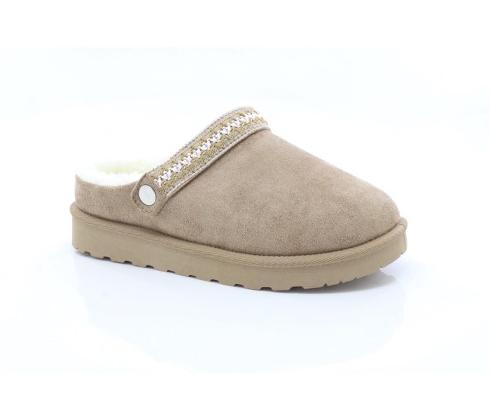 Ladies Khaki Faux Fur Lined Clogs Style Slip On Cuff Mule Slipper Sandal