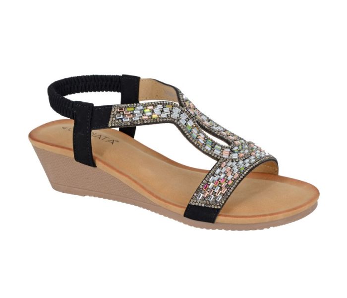 Step into elegance with the CIPRIATA Women's 'Selene' Wedge Sandal, art. L 496A. This stunning black jewelled PU sandal features a dazzling array of multi-colored crystals that add a touch of glamour to any outfit. Designed for comfort, it boasts a soft PU lining and a microfiber sock for all-day wear, while the elasticated back ensures a secure fit. The durable TPR sole provides excellent traction, making these sandals perfect for both casual outings and special occasions. Elevate your footwear collection with this exquisite blend of style and comfort.