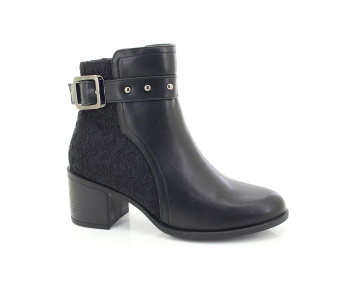 ShuCentre Ladies Embroidered Floral Buckle Strap Zip Mid Heel Ankle Boot