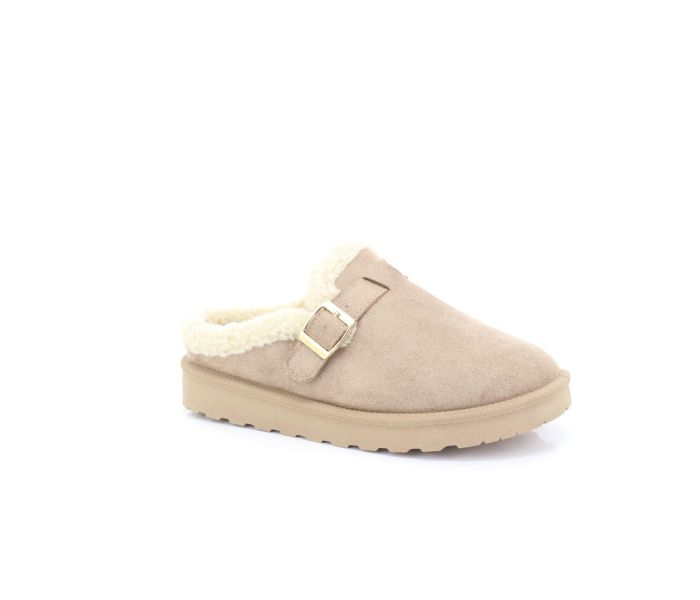 Ladies Khaki Faux Fur Lined Buckled Strap Cuff Mule Slipper