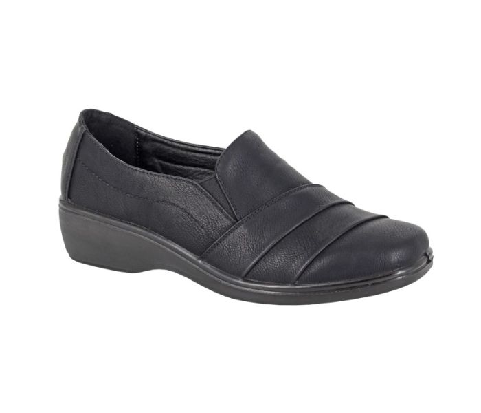 Elevate your casual wardrobe with the Boulevard Women's Black Slip-On Shoe, featuring a stylish wedge heel that combines comfort and sophistication. Crafted from durable Black Matt PU, this shoe boasts a chic twin gusset rouched design for easy on-and-off wear. The soft PU lining and padded PU sock ensure all-day comfort, while the sturdy PU sole provides excellent traction and support. Perfect for any occasion, these versatile slip-ons are a must-have addition to your footwear collection.